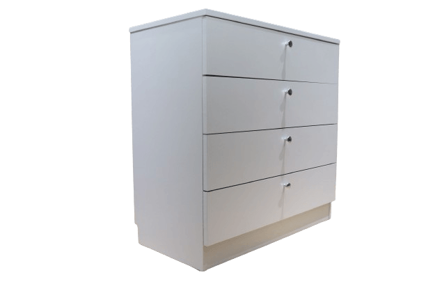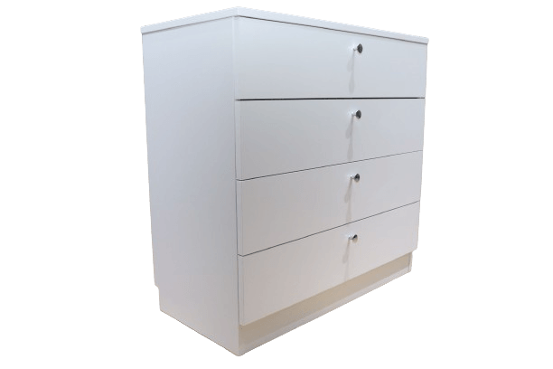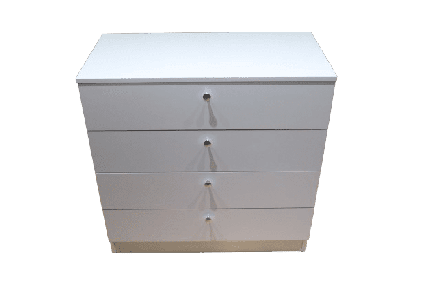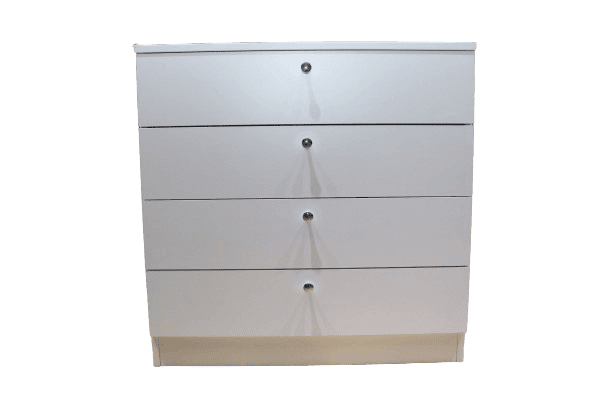 Comodă albă cu 4 sertare practice și butoni rotunzi metalici. Fabricată din PAL melaminat, cu dimensiuni de 800 x 400 x 800 mm. O piesă versatilă și elegantă, ideală pentru depozitarea hainelor sau obiectelor personale. Potrivită pentru dormitor, living sau birou. Produsă în Moldova.