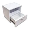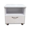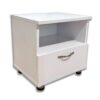 Компактный и функциональный дизайн – эта белая прикроватная тумбочка оснащена просторным ящиком и открытой полкой, идеально подходящей для хранения личных вещей или любимых книг.